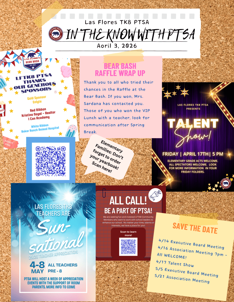 Mark your calendars for Thursday, 4/16, 7 pm. PTSA is hosting its PTSA Association Meeting. Learn about programs left in the school year, and members will be able to vote in our election.
