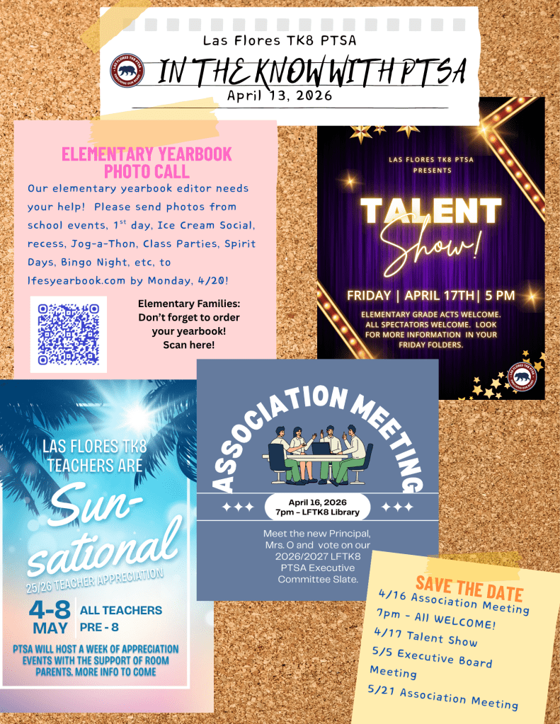 Las Flores has talent! Friday, 4/17, our elementary students will put their talents on display. Join us for a fun evening.