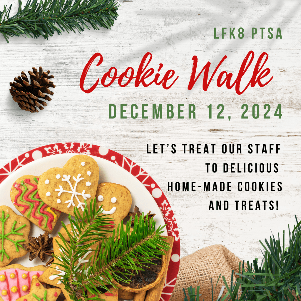 We NEED your help! This Thursday LFK8 PTSA is hosting the Annual Cookie walk for our staff. About 75 amazing staff members will enjoy a cookie buffet. We need your help baking your family favorites to share. Please click the button above to sign up!