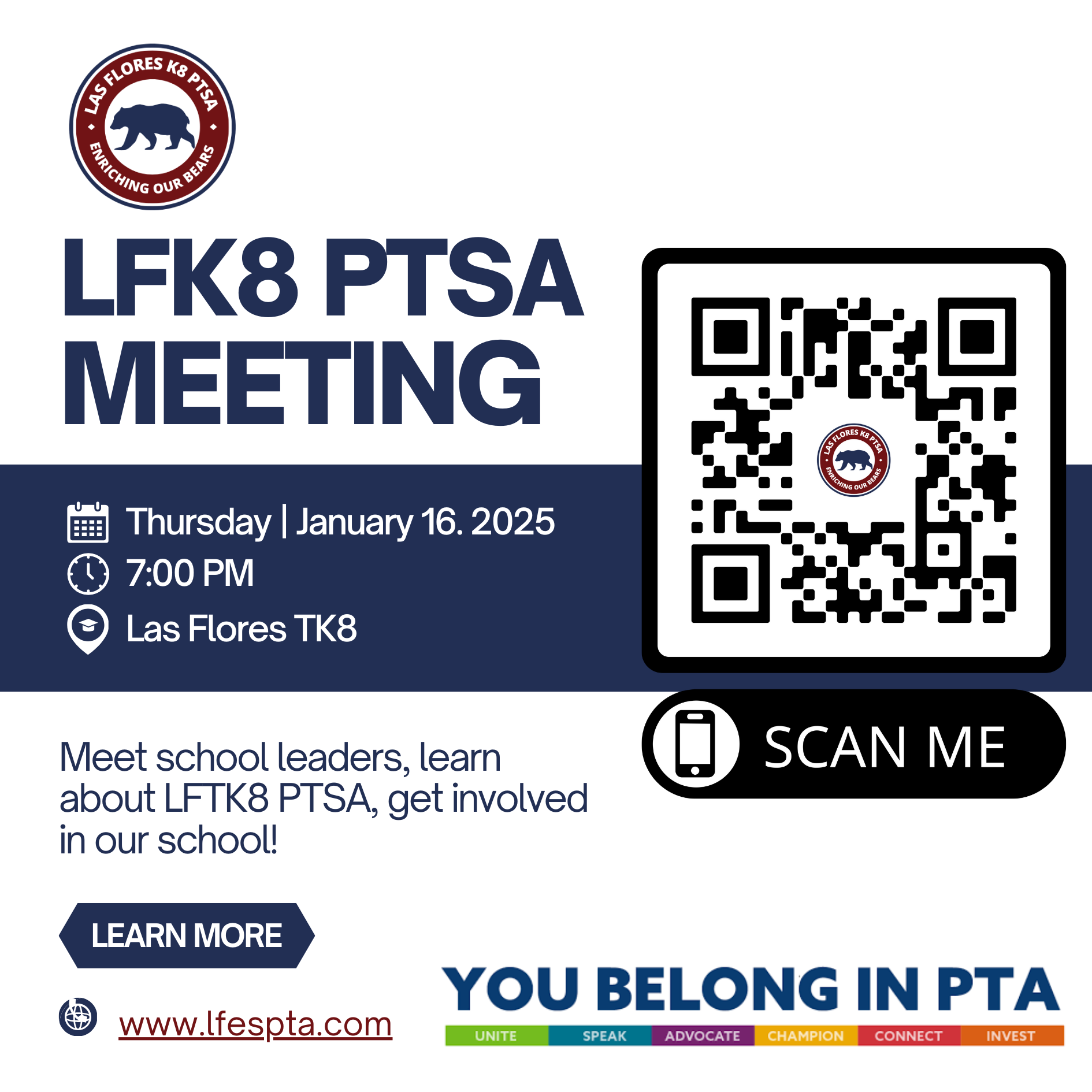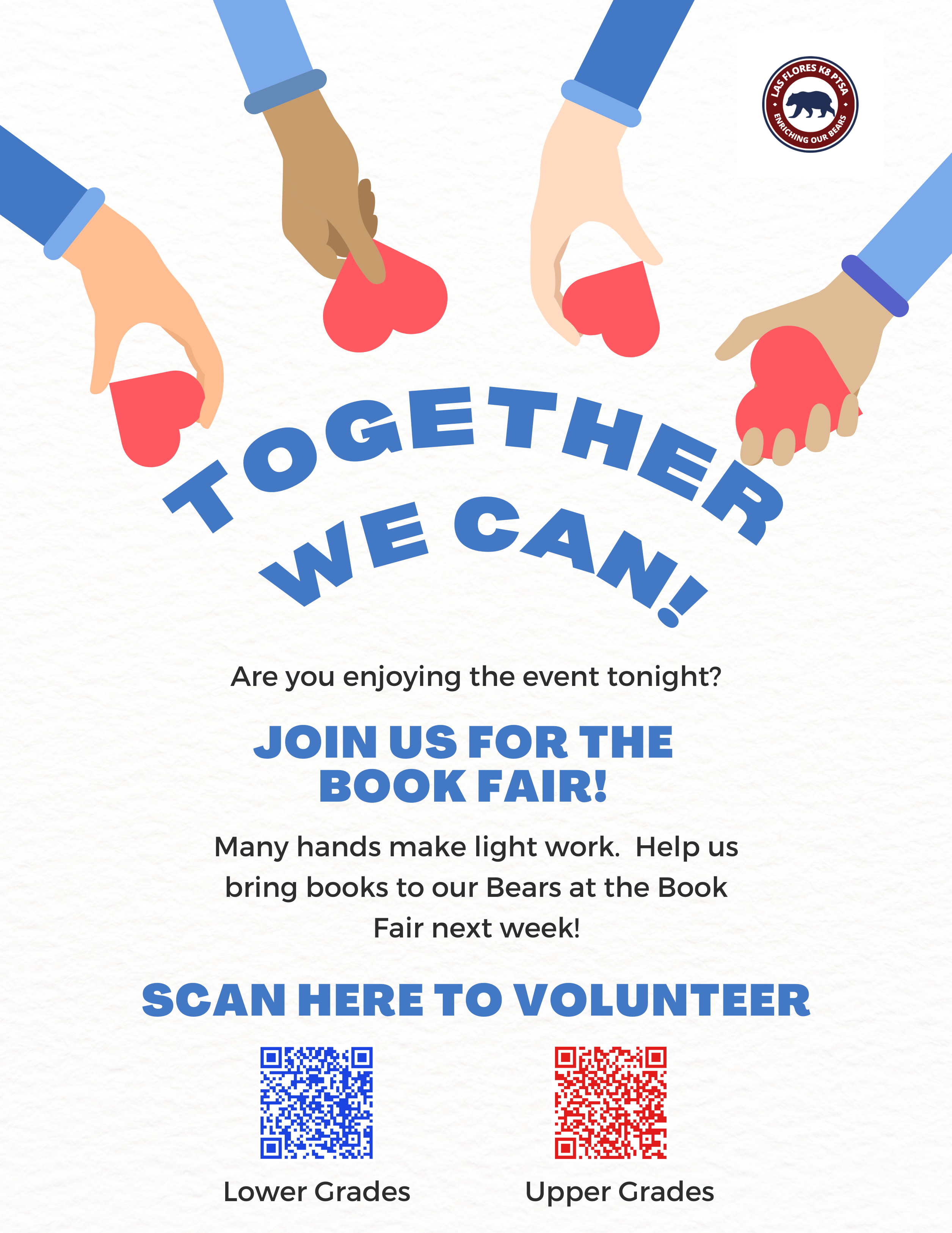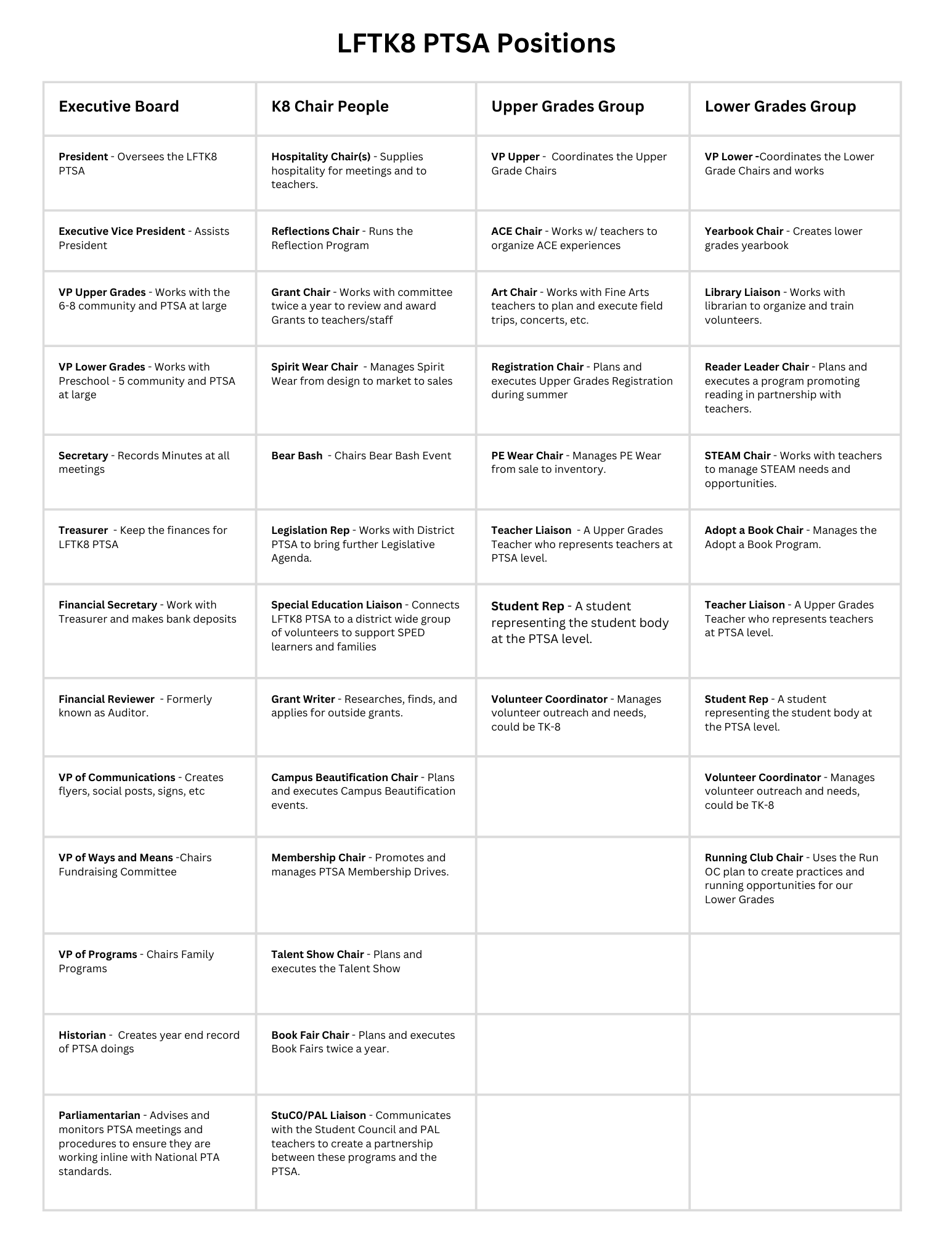 Leadership for 2025-2026 – Las Flores TK8 PTSA is proud of the work we have done to merge two groups, LFES PTA and LFMS PTSA, into one dynamic PTSA serving our whole school. We understand our school is unique blend of 3 school populations; Las Flores, Tijeras Creek and Wagon Wheel. With leaders from all 3 schools we built support system honoring ALL of our Bears, preschool – eighth grade. We look forward continuing this work into year two. Nomination season is upon us and we are looking for our next group of volunteers! No matter what your passion, talents, or available time, we have space for you. The LFTK8 Executive Board will serve preschool – 8th grade. The two Vice Presidents, a VP of Upper Grades and a VP of Lower, that will work specifically with their groups. Similarly, we will have committees serving the whole school and specific programs. Please refer to the organization chart for more information. There is a place for you to get involved in any way that works for you.