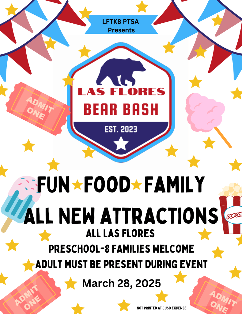 All School Bigno Night – Are you looking for a NEW fun Family Night? Join us Friday, 1/31, from 5:30 – 7:00pm in the Las Flores MPR. Bingo Cards will be on sale for $5 per card; a card can be used all night. Pizza and snacks will be available for purchase. This is an ALL school event. Family and friends are welcome! *Please note all students must have a supervising adult in attendance.