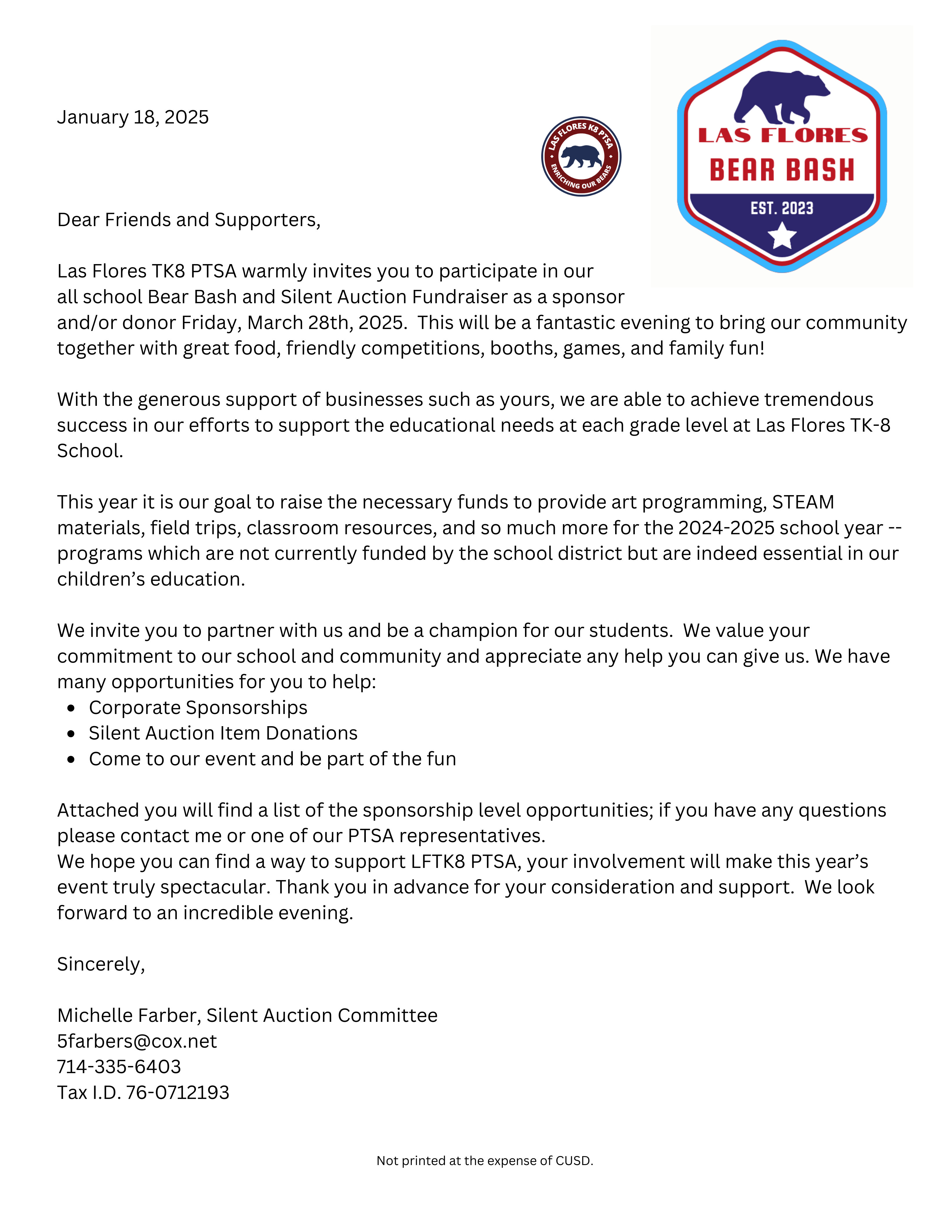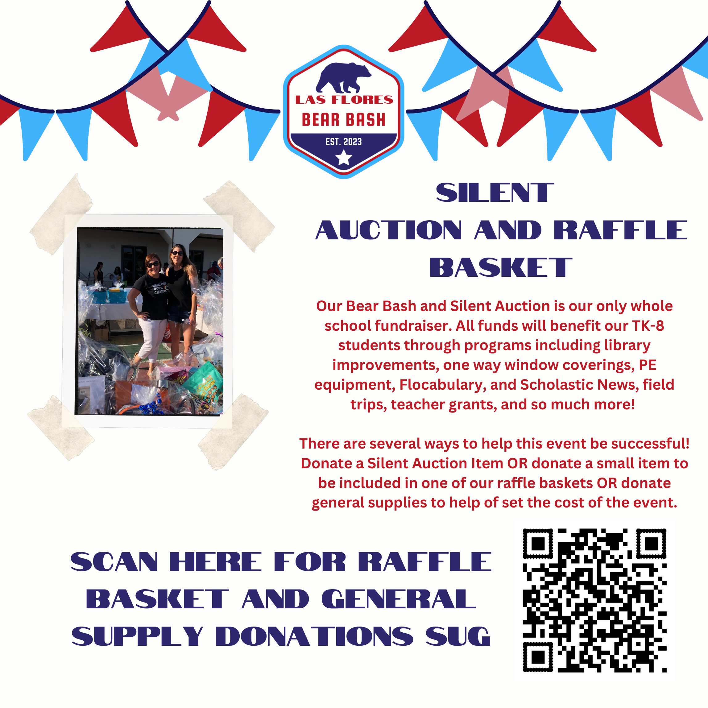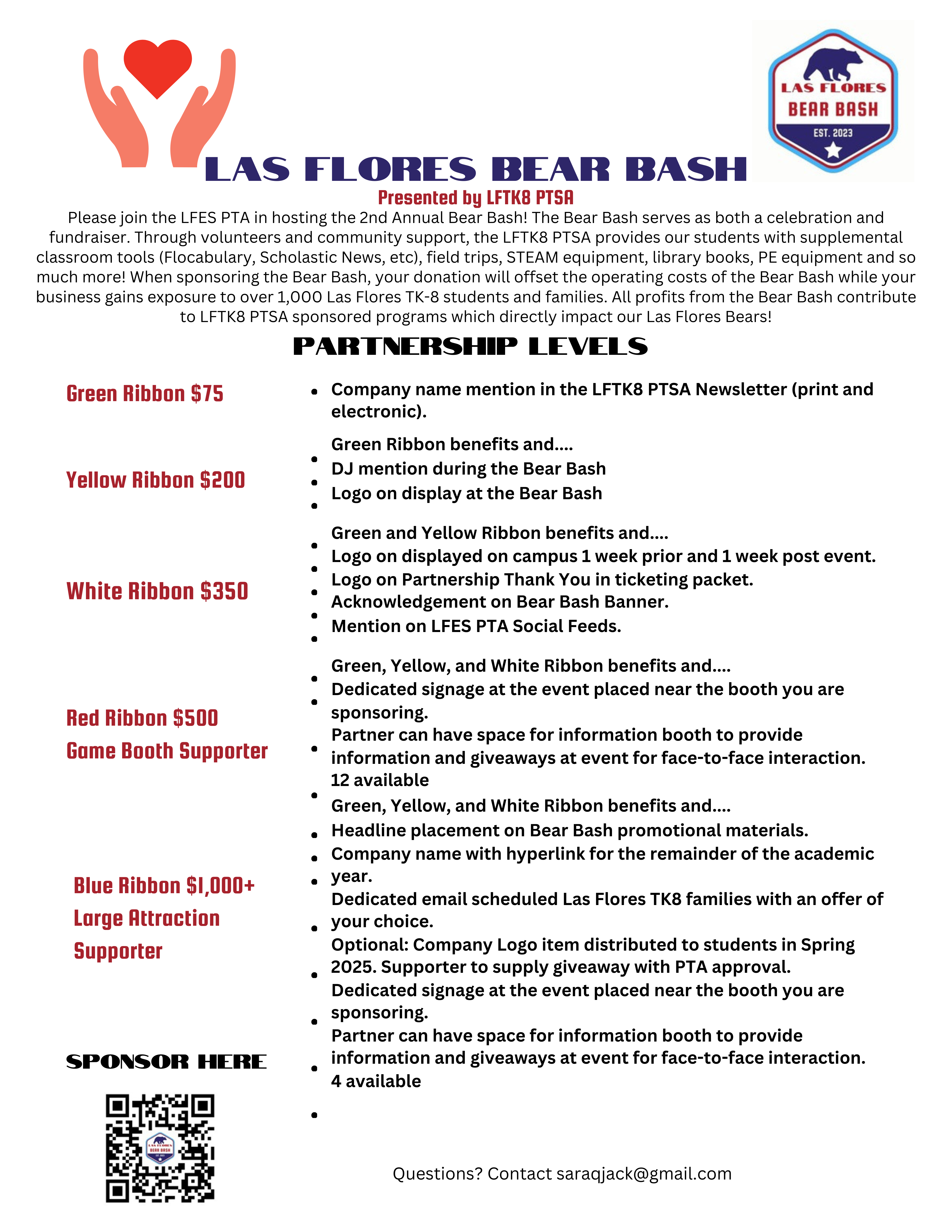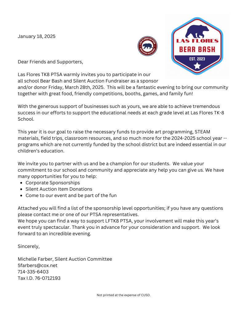 Help us make our WHOLE SCHOOL Fundraiser a raging success! Bring your WHOLE family and your friends to our school fair and silent auction. All funds raised will support our Bears preschool -8th grade through programs that provide one way window coverings, fields trips, library improvements, classroom supplies, STEAM equipment, PE equipment, Flocabulary, and Scholastic News just to name a few. Our most urgent need is for sponsorships and silent auction items. Please consider participating as a sponsor and/or contributing items to the Bear Bash. Any items, large or small, help the Silent Auction Team. Restaurant and retail gift cards, event tickets, beauty services, photography sessions, anything you think our community members would enjoy! Our donation letter is above or you can click on the button to download and print copies. Questions? Contact us at lfespta@gmail.com or Sara Jack at saraqjack@gmail.com