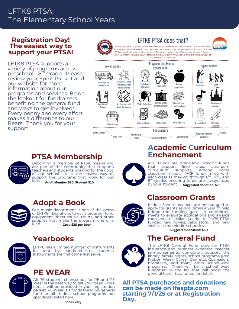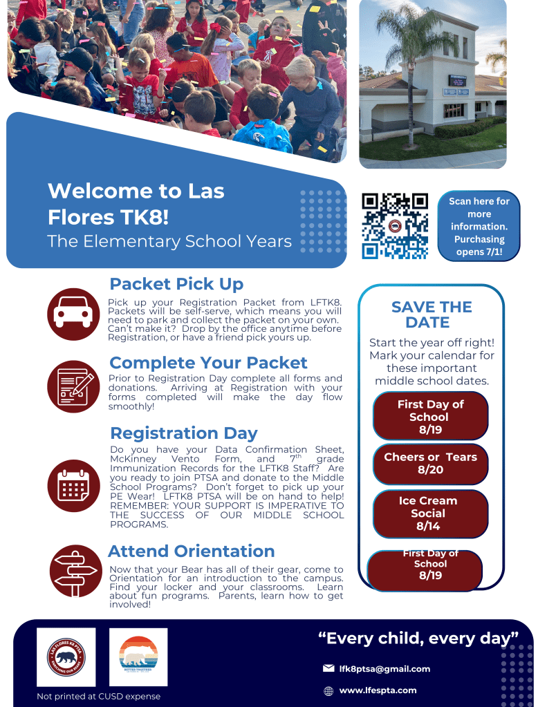 Welcome to the 2025/2026 School Year! Las Flores TK8 PTSA is excited to see you. We have big plans for the year, and they start with our Middle School Packet Pick-Up and Registration. Please stop by the school this week to pick up your packet. Please review and complete your paperwork, then bring it to Registration Day on August 11.