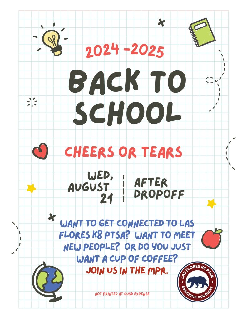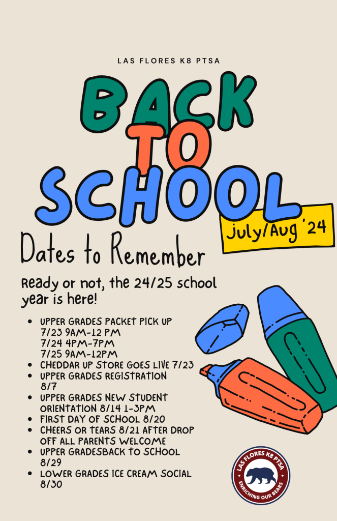 Welcome to the 2024-2025 School Year! Las Flores K8 PTSA is so happy to see our Bears back on campus. Here are a few reminders to help you this week.