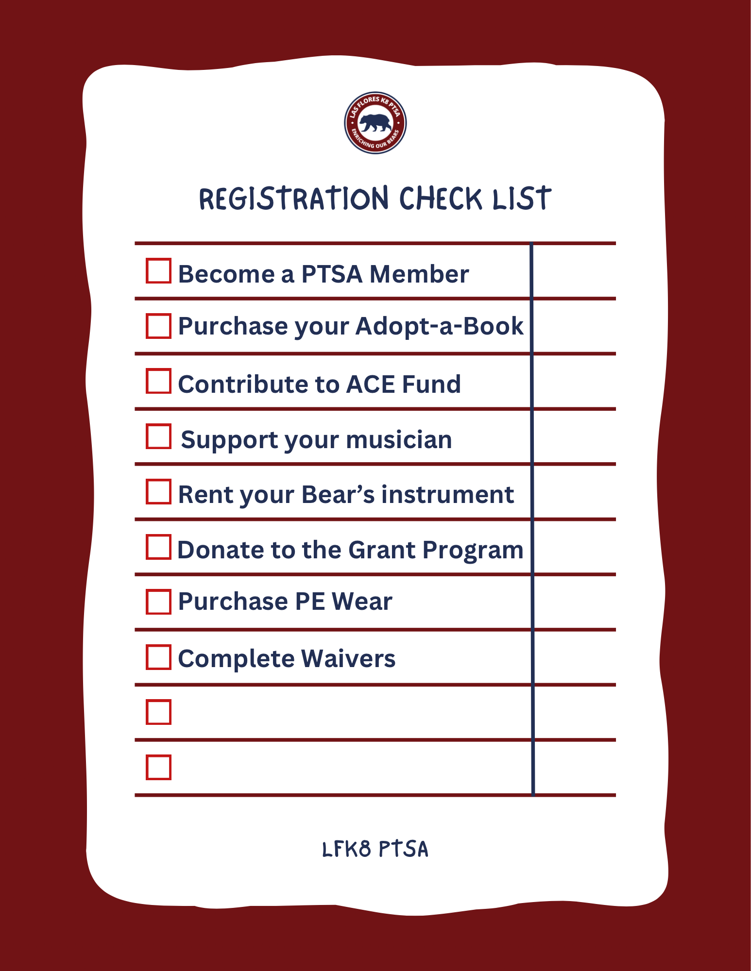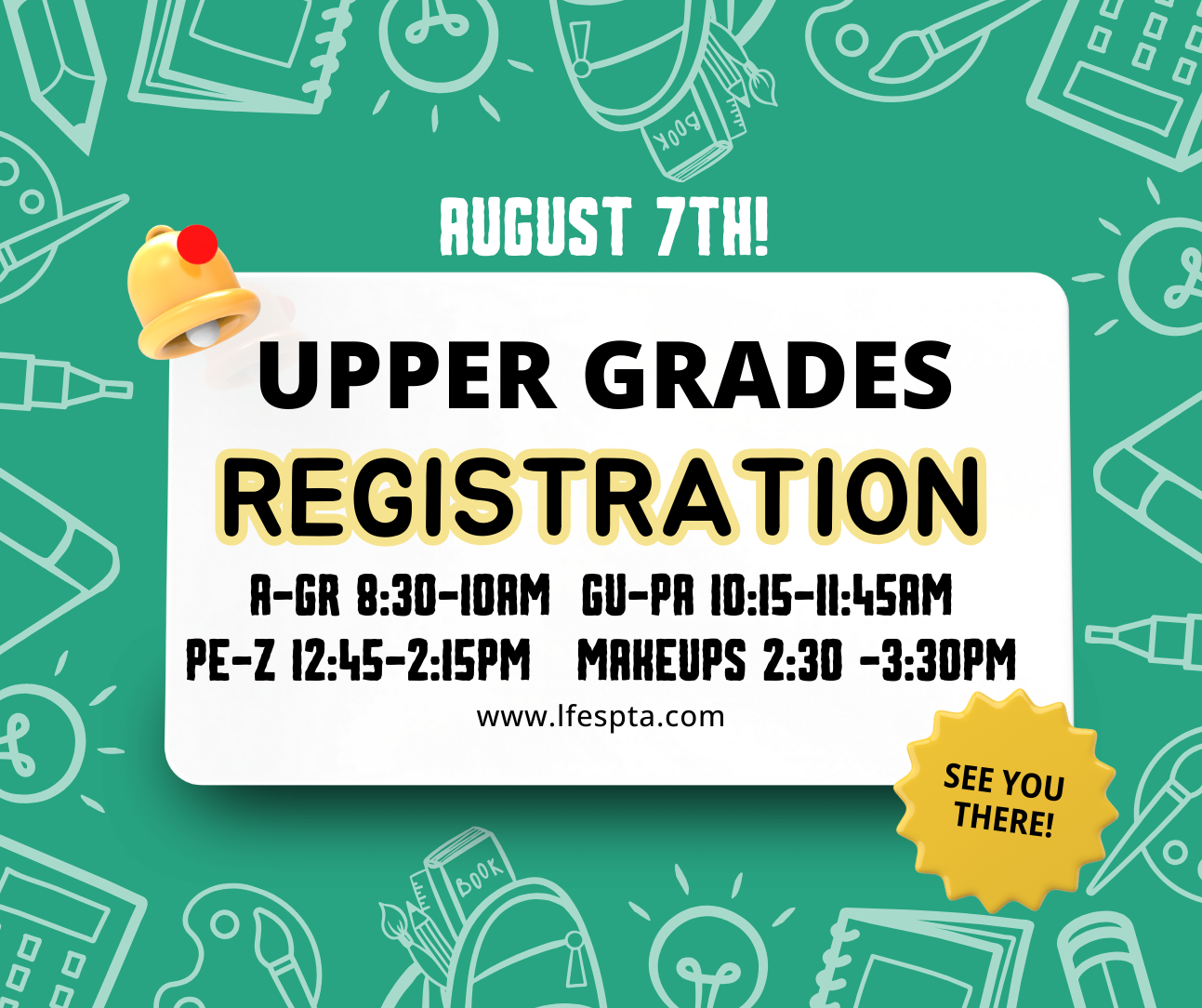 - Upper Grades (6,7,8) – There is still time to complete your Registration Packet! This includes becoming a PTSA Member and donating to programs that directly benefit your student. Please note: PE WEAR is available for purchase in the front office.