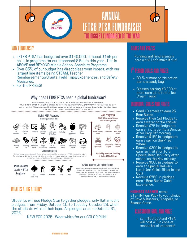 The Jog-a-Thon is HERE! Flyers below. The elementary cover page includes the kick-off. Middle School includes the global fundraiser explanation. The sponsorship information is consistent from preschool to 8th grade.